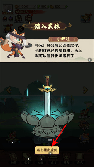 2、在剧情界面中,点击红色箭头指向的点击摸出宝剑按钮,可获取初始武器,推进踏入武林的剧情。