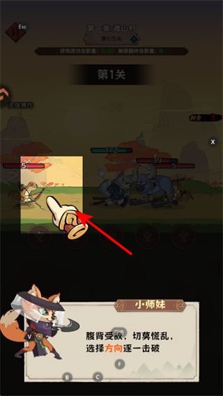 3、战斗关卡中,根据提示点击红色箭头指向的方向区域,可操控角色攻击对应位置的敌人,逐步击破对手。