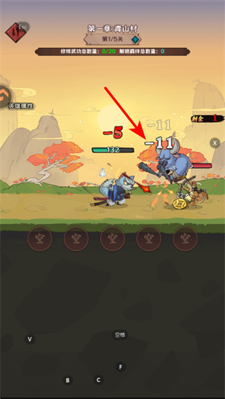 4、战斗时红色箭头指向的数值是当前攻击伤害,持续攻击敌人可削减其血量,完成关卡胜利条件。