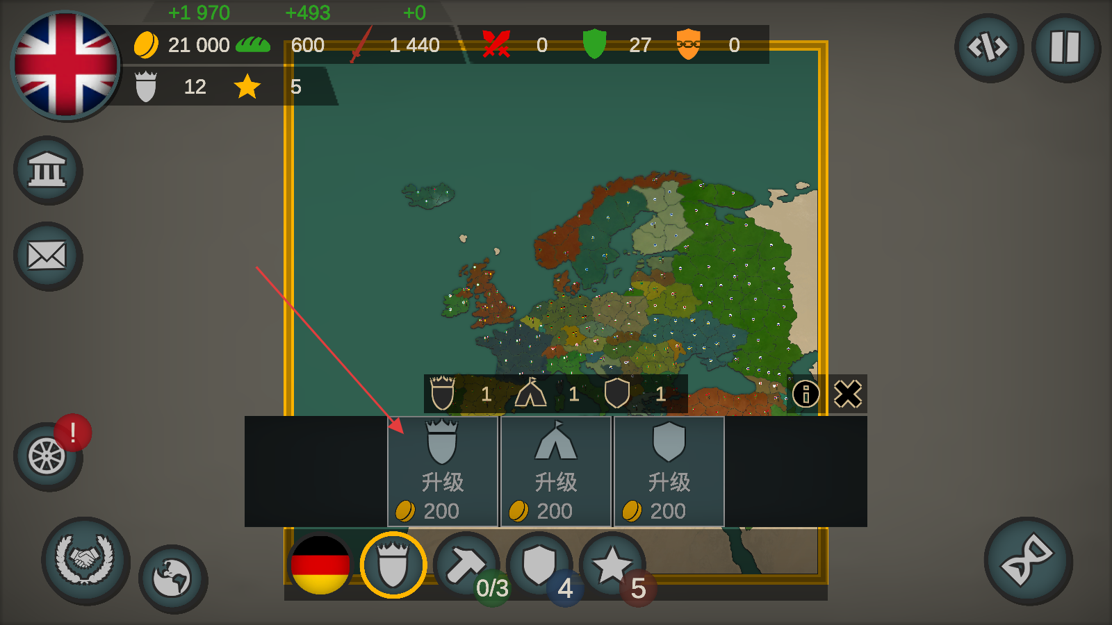 1、资源军队强化:通过完成各类任务获取金币,用金币采购强力武器装备,强化防御系统提升国家实力,逐步缩小与他国差距甚至实现全面超越。