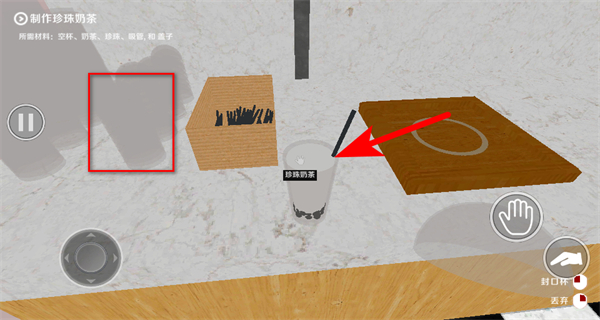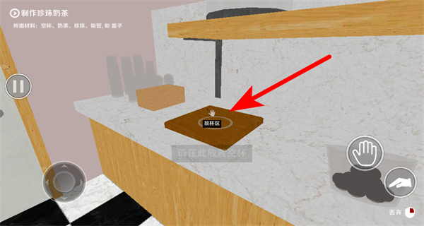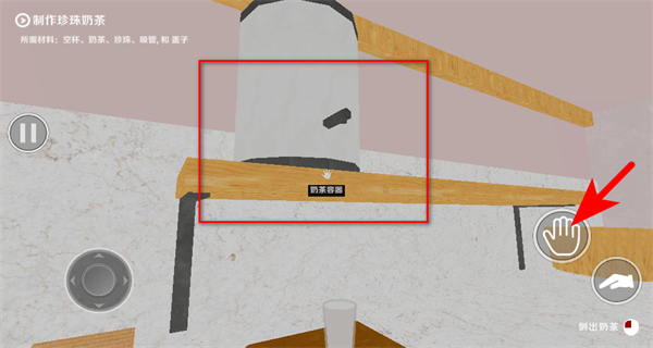 2、在容器场景中,点击手型操作按钮,与奶茶容器互动,这是获取奶茶基底的核心操作,完成后获得基础原料。
