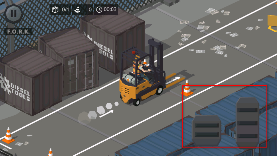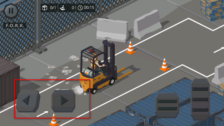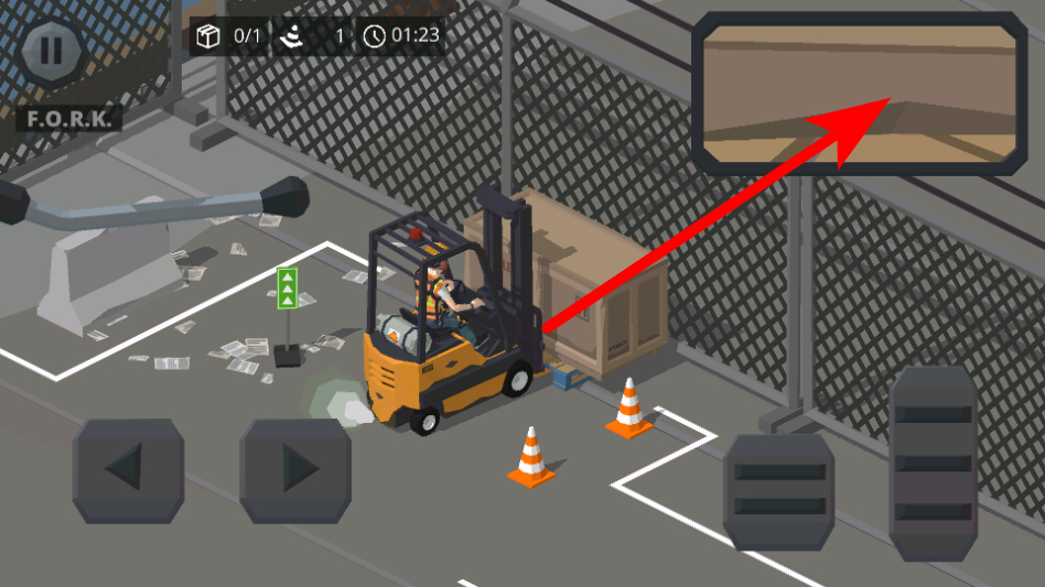 1、进入游戏后,操控叉车移动到目标货物区域,需避开场景中的锥桶等障碍物。