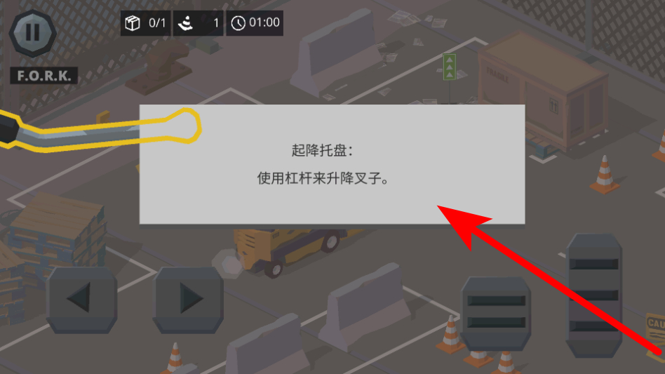 3、根据提示操作杠杆来控制叉车叉子的升降,完成起降托盘的基础操作学习。