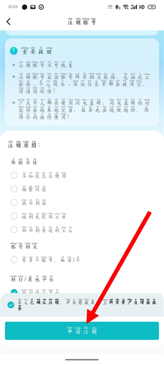 5、在注销账号页面,选择注销原因,勾选相关确认项后,点击申请注销。