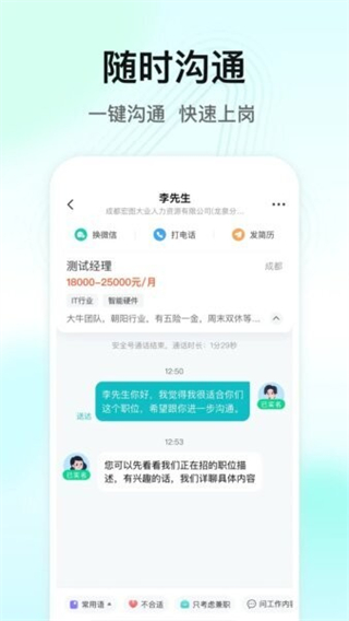 支持求职者与企业实时文字、语音沟通,无消息延迟,避免错过沟通时机,可直接在线咨询岗位细节,缩短双方沟通周期,快速推进求职招聘进程。
