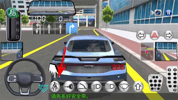 2、进入驾驶界面后,先点击红色箭头指向的安全带按钮,完成系好安全带的准备操作。