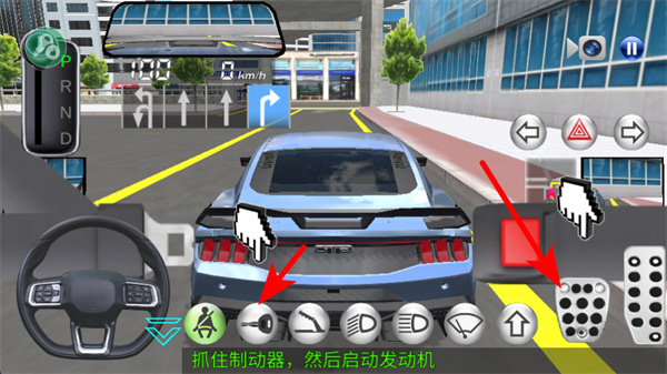 3、按照提示,先点击红色箭头指向的制动器按钮,再点击发动机按钮,完成车辆启动前的准备。