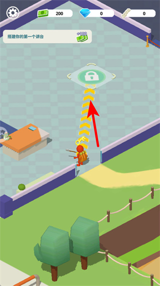 1、在初始场景,操控角色沿红色箭头指向的黄色路径移动,前往第一个讲台完成目标。
