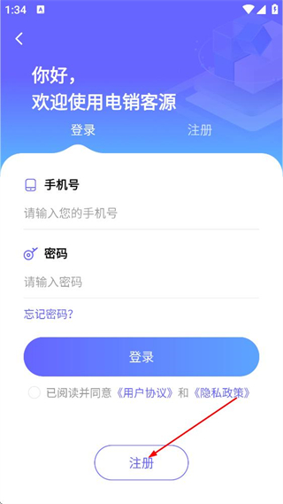 1、在电销客源的用户协议及隐私政策提示弹窗中,点击同意,进入欢迎页面。