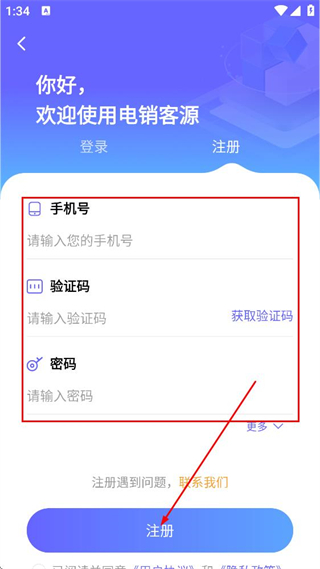 3、在注册界面,依次填写手机号、验证码以及密码,点击注册,完成电销客源的账号注册。