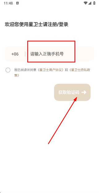 2、在手机登录页面填写手机号,勾选协议后,点击获取验证码。