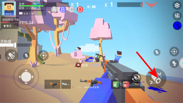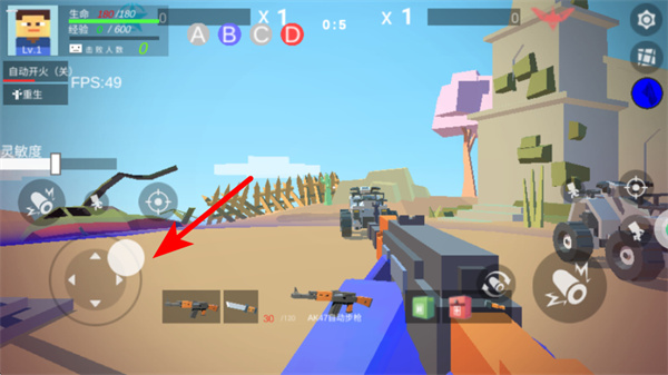 2、进入战斗后,通过红色箭头指向的左侧虚拟摇杆,可操控角色向任意方向移动,躲避僵尸攻击。