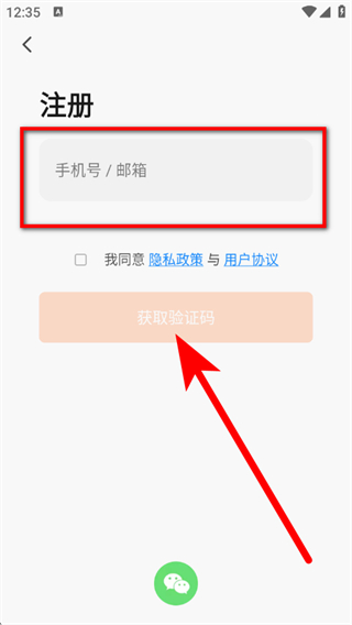 3、在注册页面,输入手机号,勾选后,点击获取验证码。