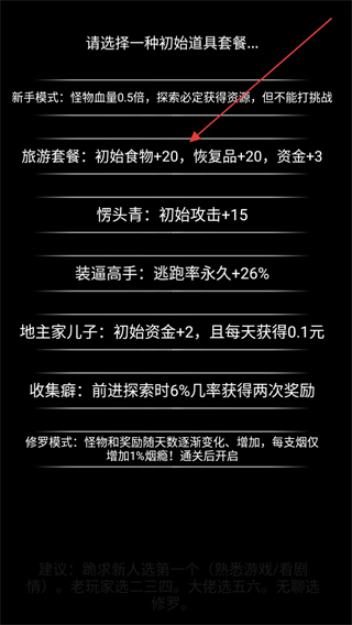 2、在初始道具套餐选择界面,选旅游套餐可获初始食物等资源,新手可先选新手模式熟悉玩法。