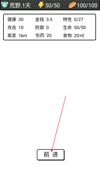 4、处于荒野界面时,点击前进按钮推进探索,同时留意自身健康、食物等属性状态保障生存。
