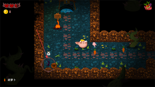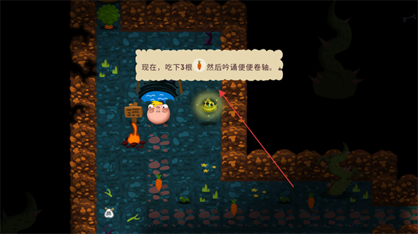 1、按提示吃下3根胡萝卜,之后前往便便便桶处,推进游戏流程。