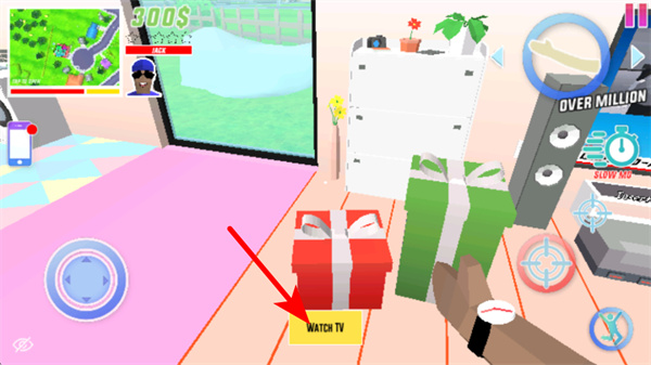 2、进入场景后,点击红色箭头指向的WATCH TV交互按钮,触发看电视的互动操作。