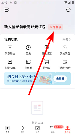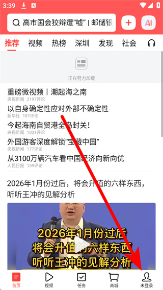 1、打开今日头条,进入后点击底部导航栏的未登录,进入登录相关页面。
