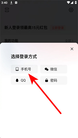 4、在选择登录方式页面,点击手机号,进入手机号码登录填写页面。