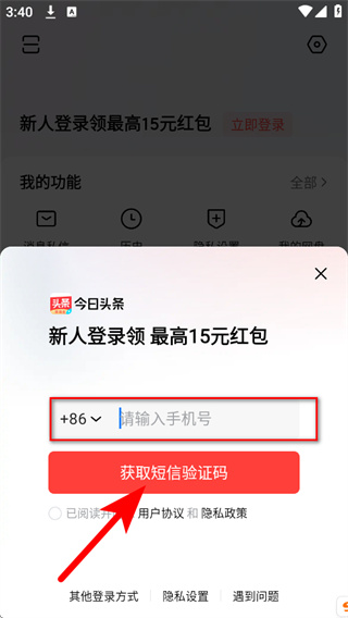 5、在手机号码登录页面,输入自己的手机号并点击获取短信验证码,