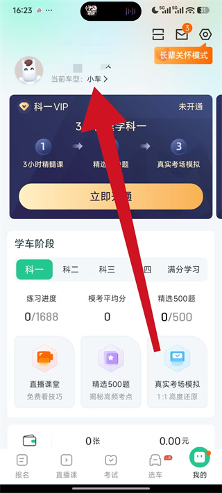 3、在个人中心页面的上方区域,点击当前车型选项,进入驾照类型选择页面。