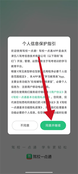 1、打开驾校一点通,进入后会弹出弹窗,点击弹窗中的同意并继续,进入应用主页面。
