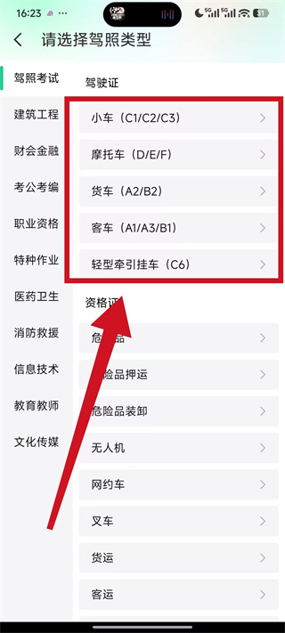 4、在驾照类型选择页面中,选择目标题库对应的驾照类型,即可完成题库的切换。