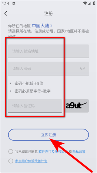 4、在注册页面,输入邮箱地址,设置密码,勾选相关协议后,点击立即注册,完成注册。