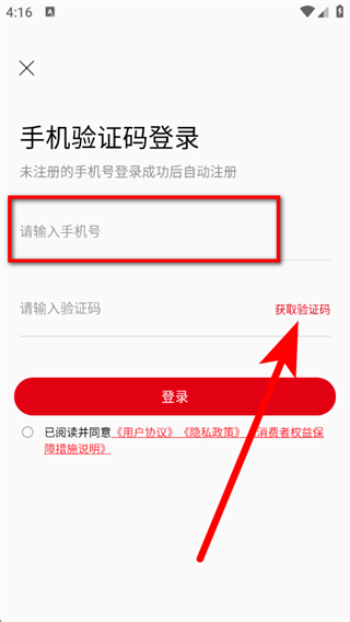 3、在手机验证码登录页面,输入手机号,点击获取验证码。
