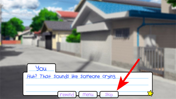 2、进入剧情场景后,若想快速推进对话,点击红色箭头指向的Skip按钮,跳过当前对话内容,直接进入后续的剧情交互环节,注意按需选择是否跳过。