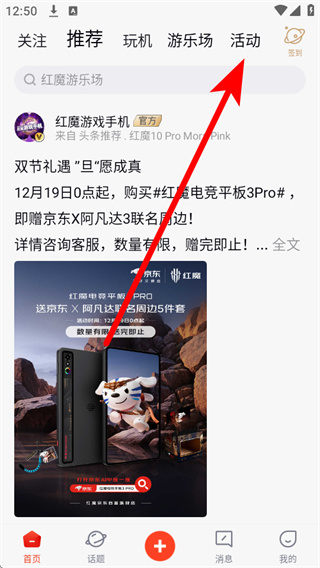 2、在应用首页的顶部导航栏,找到并点击活动,进入活动列表页面。