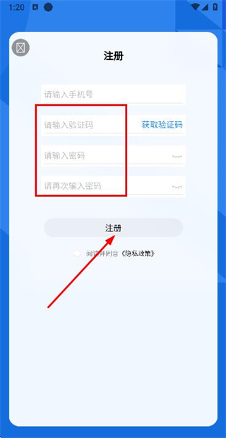 3、在注册账号页面填写验证码和密码,勾选协议后点击注册完成注册操作。