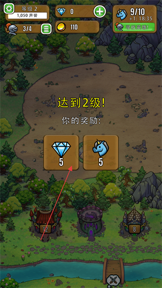 2、升级至2级,获得5钻石和5独角兽奖励,界面显示达到2级。