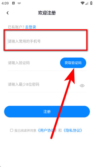 3、在欢迎注册页面,输入手机号,点击获取验证码。