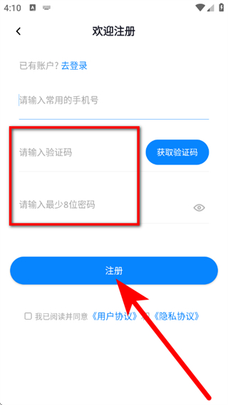 4、输入验证码,设置密码,勾选相关协议后,点击注册,完成注册。