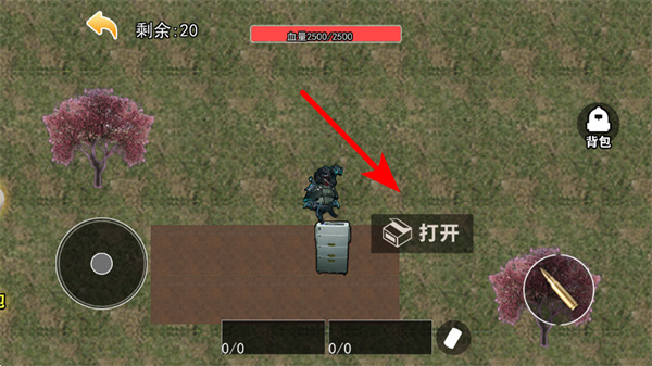 2、进入关卡后,操控角色移动到红色箭头指向的箱子旁,点击打开按钮获取箱内物资,为后续战斗收集资源,推进关卡准备流程。