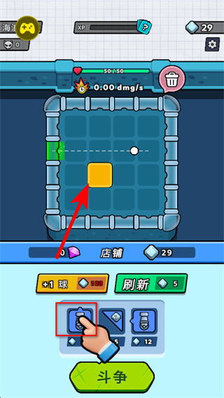 1、进入游戏界面后,点击红色箭头指向的道具选项,消耗钻石将其部署到方格内的目标区域,这是开启道具战斗玩法的关键操作。