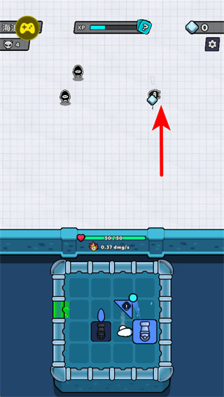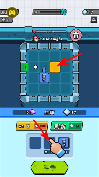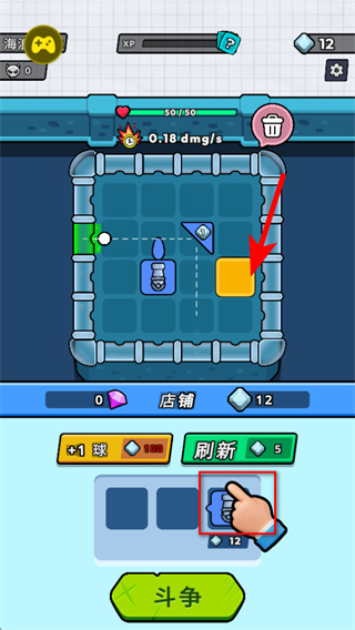 3、后续点击红色箭头指向的高级道具选项,消耗钻石将其部署到方格区域,进一步强化阵容的伤害能力,持续推进关卡的战斗进度。