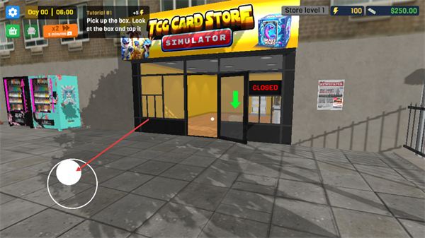 1、在tcg卡牌商店外,依据Tutorial的提示,操控移动至商店内对应位置,准备执行拾取箱子的操作。