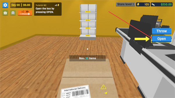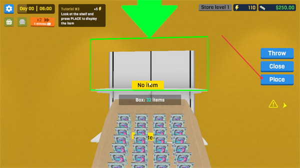 4、箱子打开后,遵循Tutorial的提示,按下PLACE按钮,将卡牌包放置到显示Noitem的货架上完成展示布置。