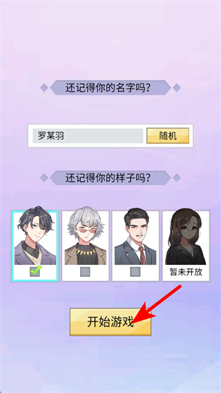 1、进入角色创建界面后,选择名字与形象默认已选,点击红色箭头指向的开始游戏按钮,进入流程,开启关键操作。