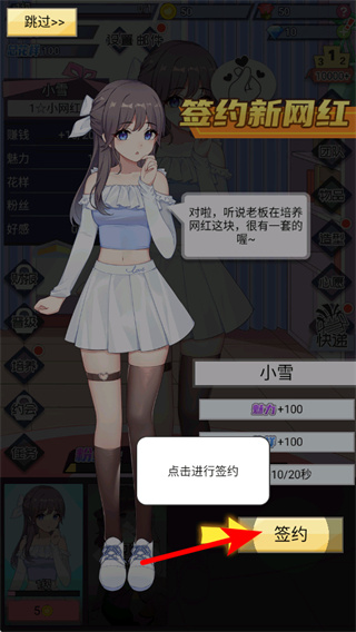 2、在签约界面中,点击红色箭头指向的签约按钮,与网红小雪完成签约,获取对应的网红角色,推进养成流程。