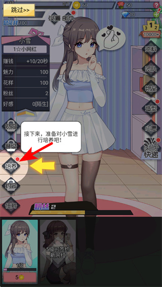 3、签约完成后,点击红色箭头指向的培养按钮,进入网红的培养界面,准备提升其属性魅力、花样等。