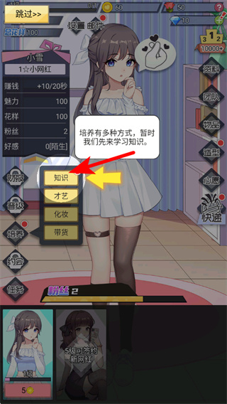 4、在培养选项中,点击红色箭头指向的知识按钮,通过学习知识的方式提升网红属性,推进养成进度。
