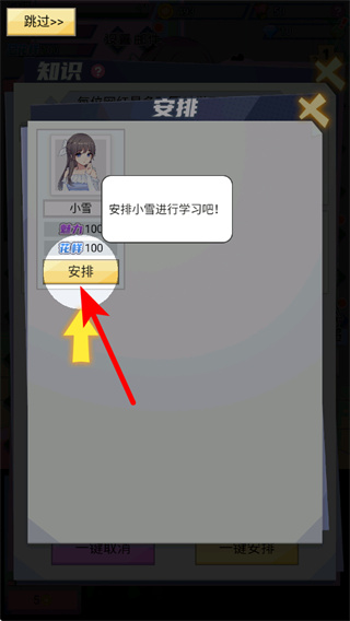 2、在安排界面中,点击红色箭头指向的安排按钮,确认让小雪进行知识学习,推进其属性成长进度。