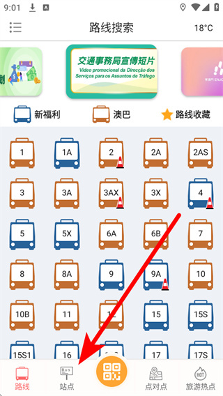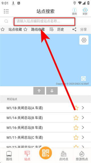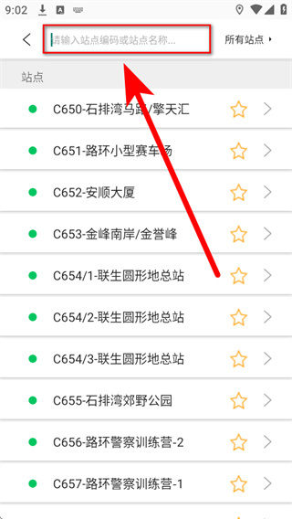 1、打开巴士报站类应用,在路线搜索页面点击底部导航栏的站点,进入站点页面。
