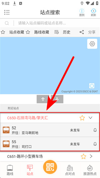 4、在站点列表中选择需要查看的目标站点,即可查看该站点对应的巴士班次报站信息。