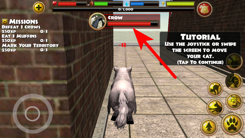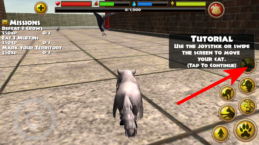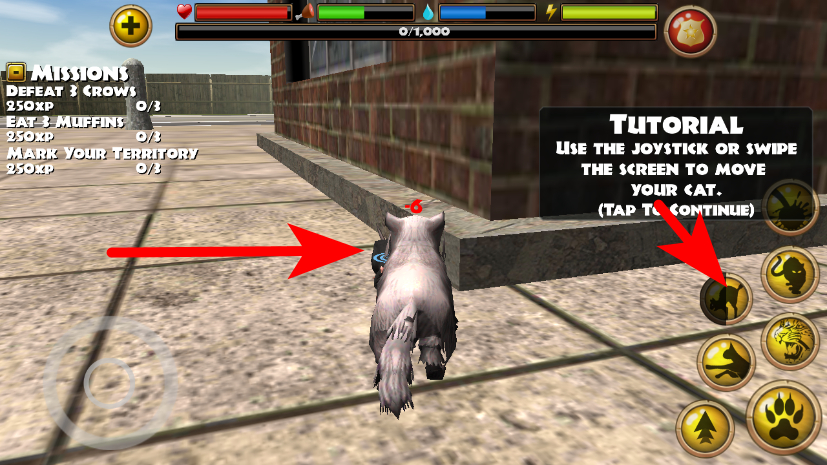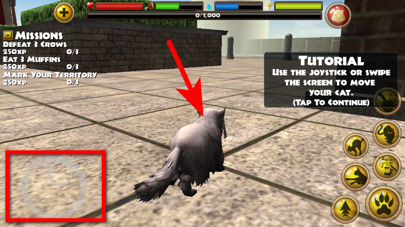 1、在游戏界面,操作左侧摇杆,控制猫咪移动方向。