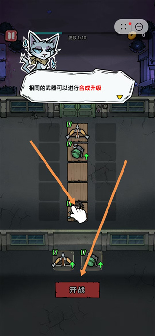 2、在备战界面,将相同等级武器拖拽合成,提升武器等级点击开战。
