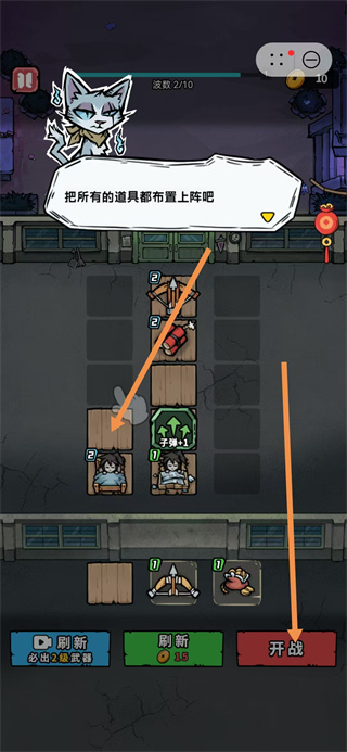 4、通关后在备战界面,把所有道具布置到空位,点击开战继续。